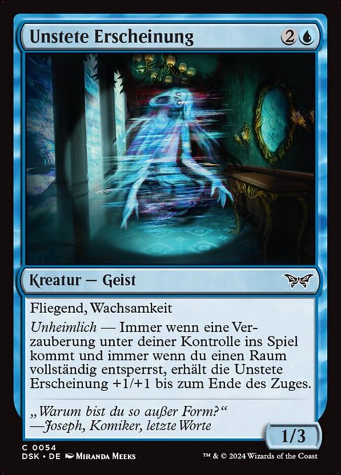 Eerie — Whenever an enchantment you control enters and whenever you fully unlock a Room, Erratic Apparition gets +1/+1 until end of turn.
