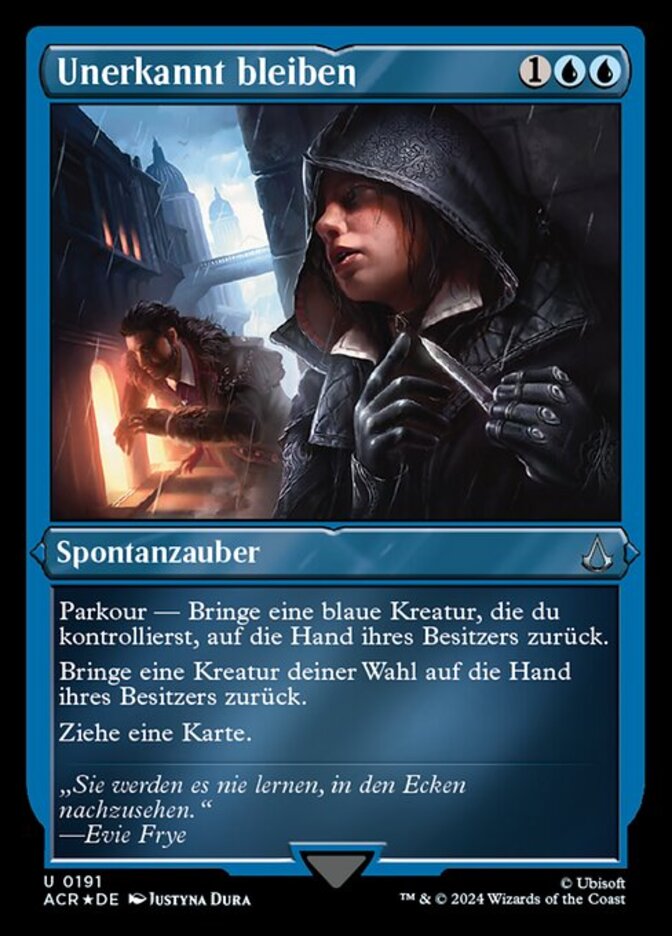 | Rules | Freerunning—Return a blue creature you control to its owner's hand. (You may cast this spell for its freerunning cost if you dealt combat damage to a player this turn with an Assassin or commander.) Return target creature to its owner's hand. Draw a card. |