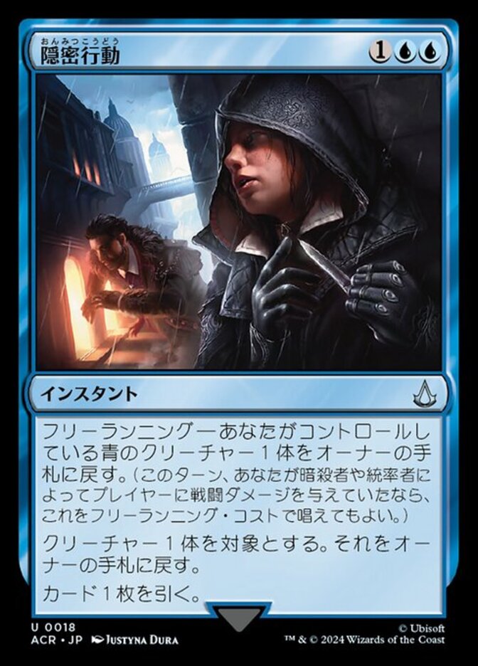 | Rules | Freerunning—Return a blue creature you control to its owner's hand. (You may cast this spell for its freerunning cost if you dealt combat damage to a player this turn with an Assassin or commander.) Return target creature to its owner's hand. Draw a card. |