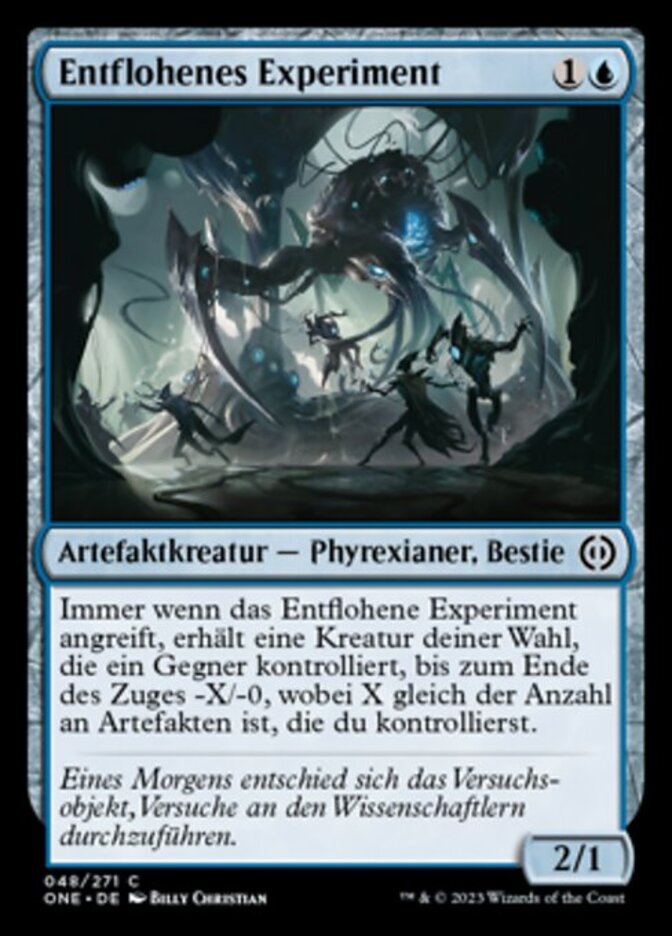 | Rules | Whenever Escaped Experiment attacks, target creature an opponent controls gets -X/-0 until end of turn, where X is the number of artifacts you control. |