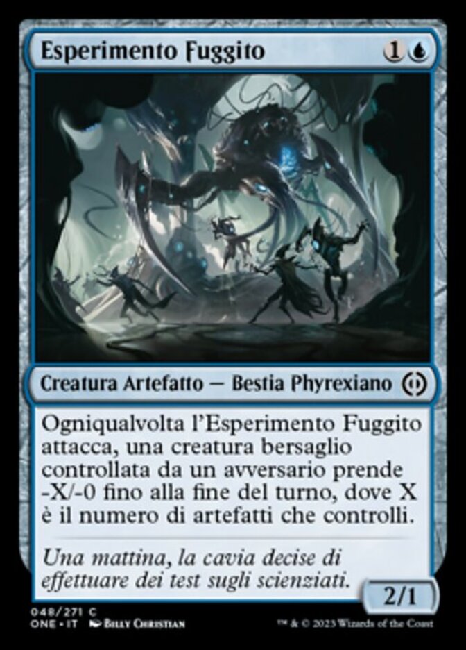 | Rules | Whenever Escaped Experiment attacks, target creature an opponent controls gets -X/-0 until end of turn, where X is the number of artifacts you control. |