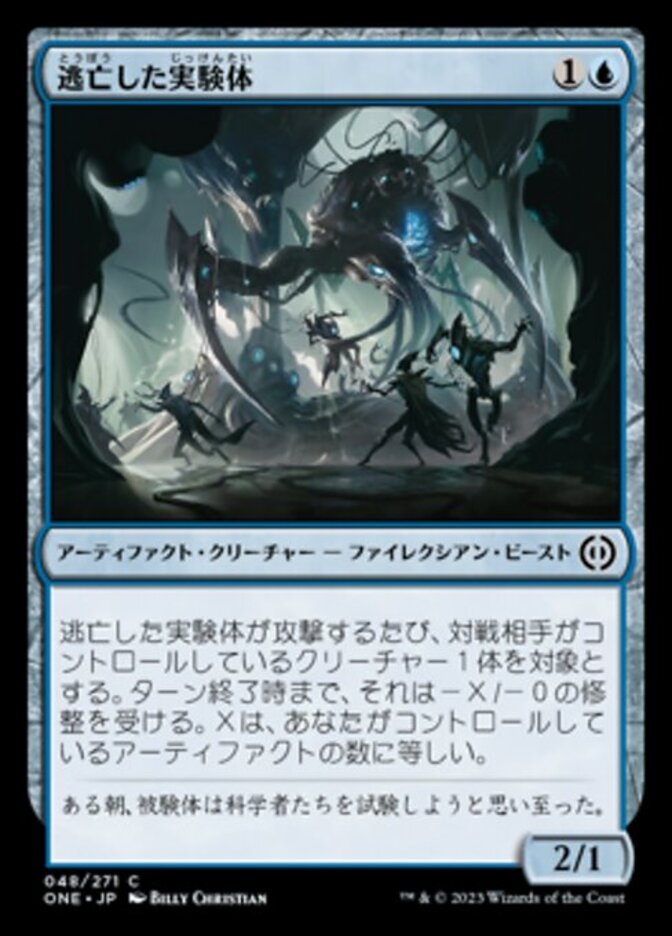 | Rules | Whenever Escaped Experiment attacks, target creature an opponent controls gets -X/-0 until end of turn, where X is the number of artifacts you control. |