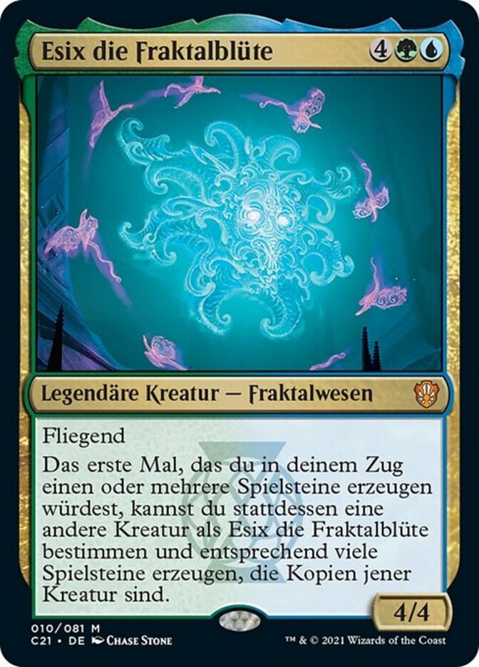 | Rules | Flying The first time you would create one or more tokens during each of your turns, you may instead choose a creature other than Esix, Fractal Bloom and create that many tokens that are copies of that creature. |