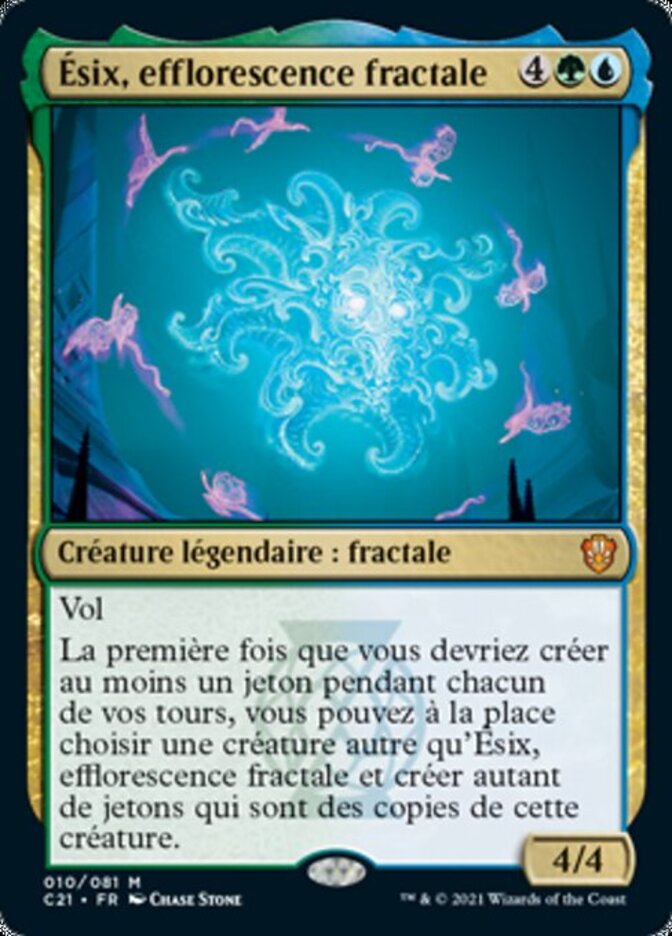 | Rules | Flying The first time you would create one or more tokens during each of your turns, you may instead choose a creature other than Esix, Fractal Bloom and create that many tokens that are copies of that creature. |