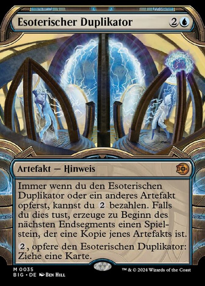 | Rules | Whenever you sacrifice Esoteric Duplicator or another artifact, you may pay . If you do, at the beginning of the next end step, create a token that's a copy of that artifact. , Sacrifice Esoteric Duplicator: Draw a card. |