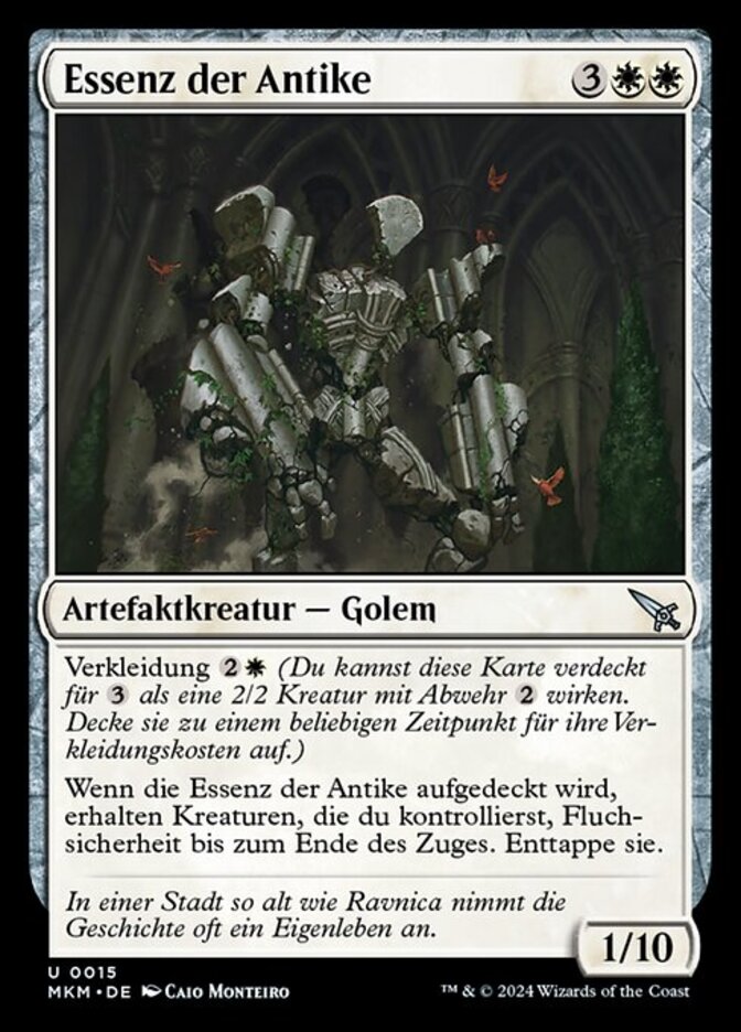 | Rules | Disguise (You may cast this card face down for as a 2/2 creature with ward . Turn it face up any time for its disguise cost.) When Essence of Antiquity is turned face up, creatures you control gain hexproof until end of turn. Untap them. |