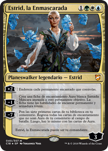 | Rules | +2: Untap each enchanted permanent you control. −1: Create a white Aura enchantment token named Mask attached to another target permanent. The token has enchant permanent and totem armor. −7: Mill seven cards. Return all non-Aura enchantment cards from your graveyard to the battlefield, then do the same for Aura cards. Estrid, the Masked can be your commander. |