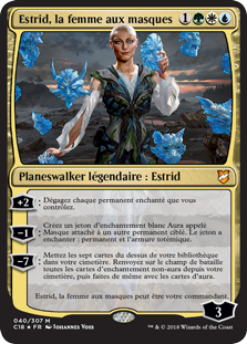 | Rules | +2: Untap each enchanted permanent you control. −1: Create a white Aura enchantment token named Mask attached to another target permanent. The token has enchant permanent and totem armor. −7: Mill seven cards. Return all non-Aura enchantment cards from your graveyard to the battlefield, then do the same for Aura cards. Estrid, the Masked can be your commander. |