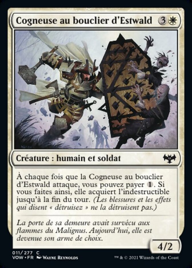 | Rules | Whenever Estwald Shieldbasher attacks, you may pay . If you do, it gains indestructible until end of turn. (Damage and effects that say "destroy" don't destroy it.) |