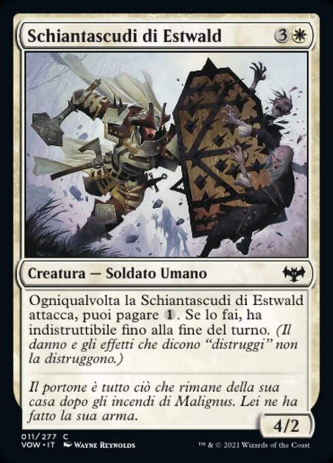 | Rules | Whenever Estwald Shieldbasher attacks, you may pay . If you do, it gains indestructible until end of turn. (Damage and effects that say "destroy" don't destroy it.) |