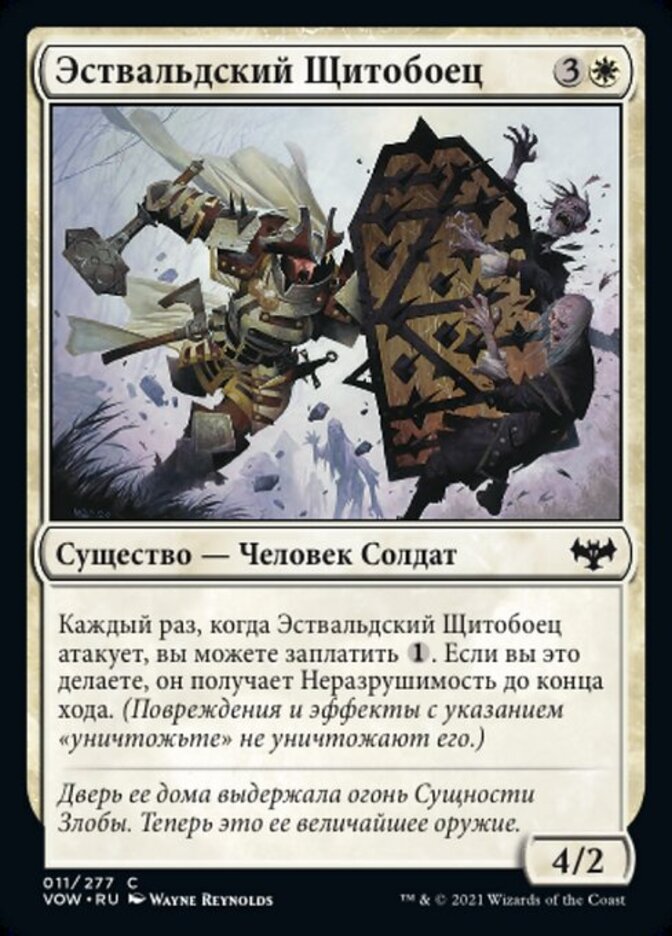 | Rules | Whenever Estwald Shieldbasher attacks, you may pay . If you do, it gains indestructible until end of turn. (Damage and effects that say "destroy" don't destroy it.) |
