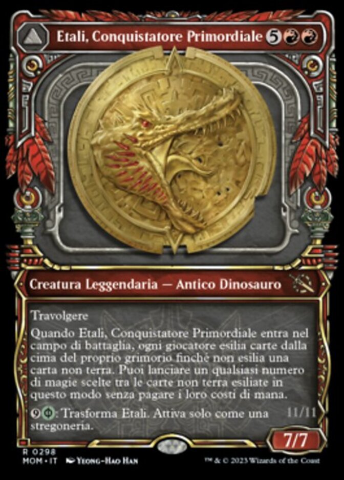 | Rules | Trample When Etali, Primal Conqueror enters the battlefield, each player exiles cards from the top of their library until they exile a nonland card. You may cast any number of spells from among the nonland cards exiled this way without paying their mana costs. : Transform Etali. Activate only as a sorcery. // Trample, indestructible Whenever Etali, Primal Sickness deals combat damage to a player, they get that many poison counters. (A player with ten or more poison counters loses the game.) |