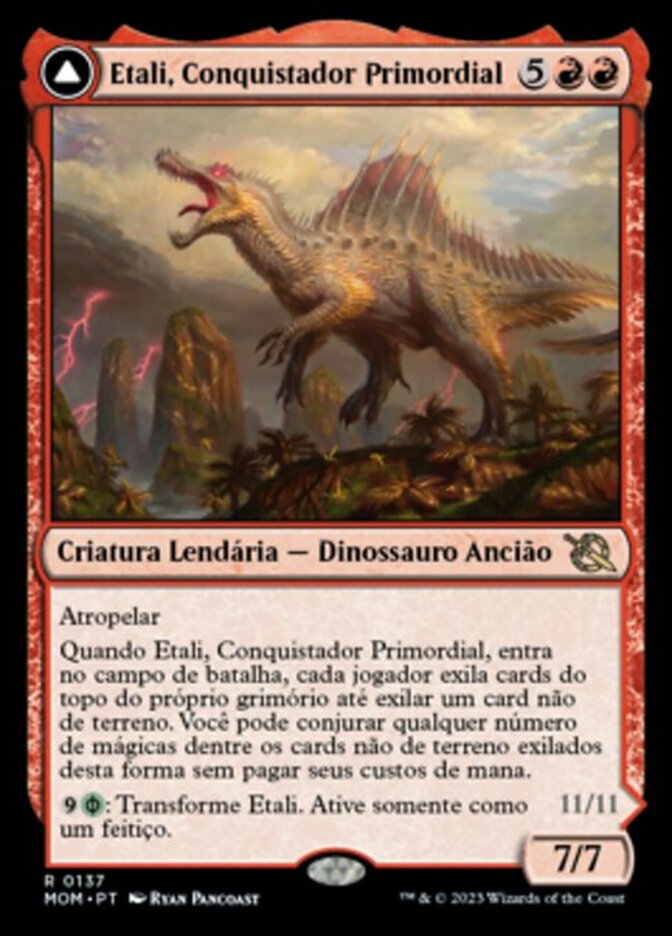 | Rules | Trample When Etali, Primal Conqueror enters the battlefield, each player exiles cards from the top of their library until they exile a nonland card. You may cast any number of spells from among the nonland cards exiled this way without paying their mana costs. : Transform Etali. Activate only as a sorcery. // Trample, indestructible Whenever Etali, Primal Sickness deals combat damage to a player, they get that many poison counters. (A player with ten or more poison counters loses the game.) |