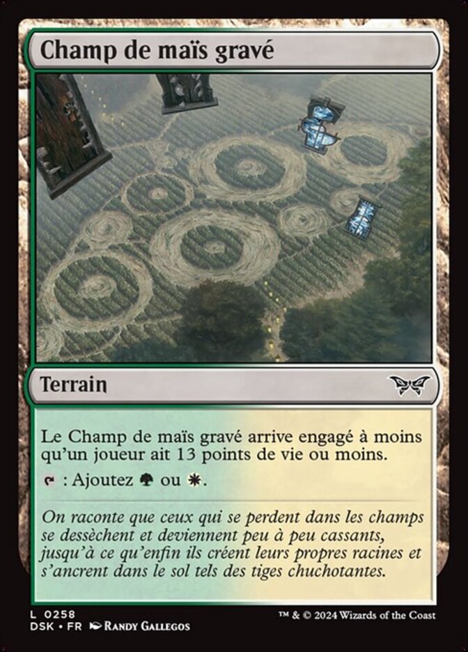 | Rules | Etched Cornfield enters tapped unless a player has 13 or less life. : Add or . |