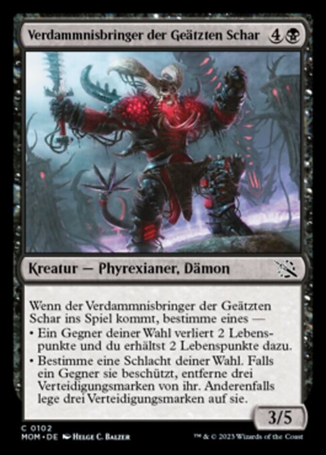 | Rules | When Etched Host Doombringer enters the battlefield, choose one — • Target opponent loses 2 life and you gain 2 life. • Choose target battle. If an opponent protects it, remove three defense counters from it. Otherwise, put three defense counters on it. |