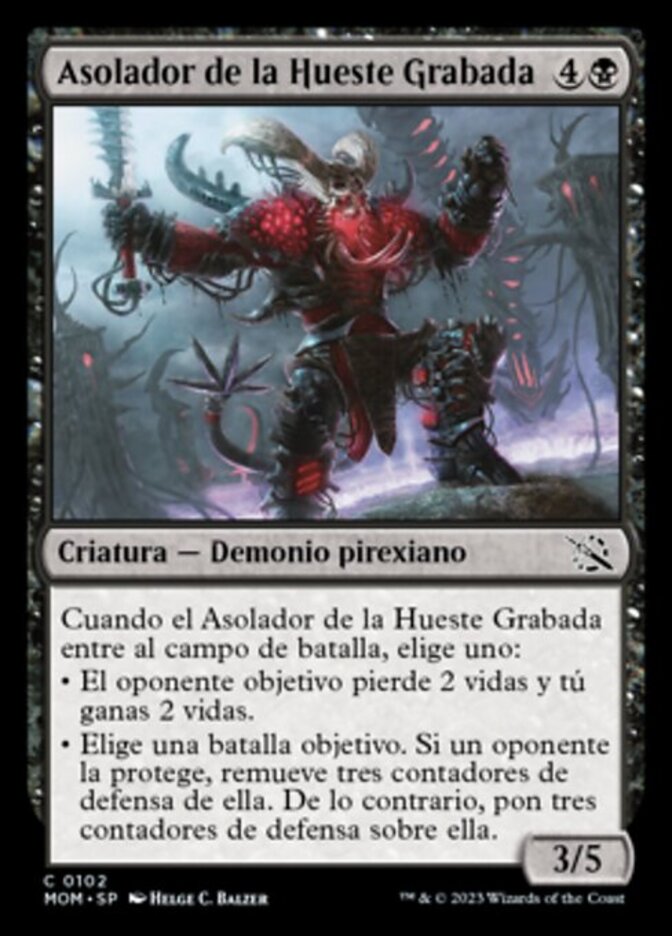 | Rules | When Etched Host Doombringer enters the battlefield, choose one — • Target opponent loses 2 life and you gain 2 life. • Choose target battle. If an opponent protects it, remove three defense counters from it. Otherwise, put three defense counters on it. |