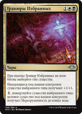| Rules | As Etchings of the Chosen enters the battlefield, choose a creature type. Creatures you control of the chosen type get +1/+1. , Sacrifice a creature of the chosen type: Target creature you control gains indestructible until end of turn. |
