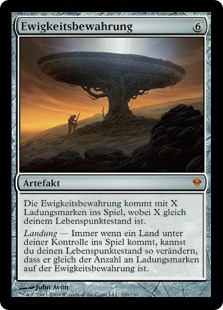 | Rules | Eternity Vessel enters the battlefield with X charge counters on it, where X is your life total. Landfall — Whenever a land enters the battlefield under your control, you may have your life total become the number of charge counters on Eternity Vessel. |