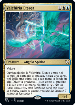 | Rules | Flying Whenever Ethereal Valkyrie enters the battlefield or attacks, draw a card, then exile a card from your hand face down. It becomes foretold. Its foretell cost is its mana cost reduced by . (On a later turn, you may cast it for its foretell cost, even if this creature has left the battlefield.) |