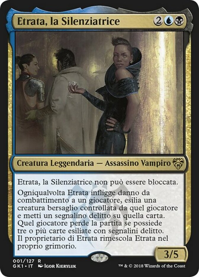 | Rules | Etrata, the Silencer can't be blocked. Whenever Etrata deals combat damage to a player, exile target creature that player controls and put a hit counter on that card. That player loses the game if they own three or more exiled cards with hit counters on them. Etrata's owner shuffles Etrata into their library. |