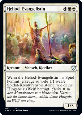 | Rules | When Evangel of Heliod enters the battlefield, create a number of 1/1 white Soldier creature tokens equal to your devotion to white. (Each in the mana costs of permanents you control counts toward your devotion to white.) |