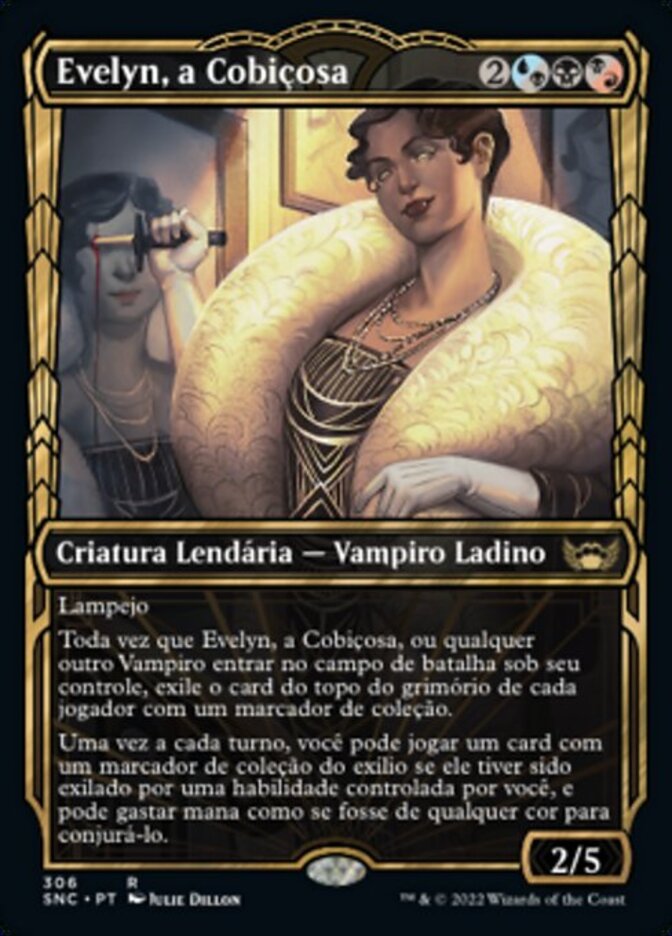 | Rules | Flash Whenever Evelyn, the Covetous or another Vampire enters the battlefield under your control, exile the top card of each player's library with a collection counter on it. Once each turn, you may play a card from exile with a collection counter on it if it was exiled by an ability you controlled, and you may spend mana as though it were any color to cast it. |