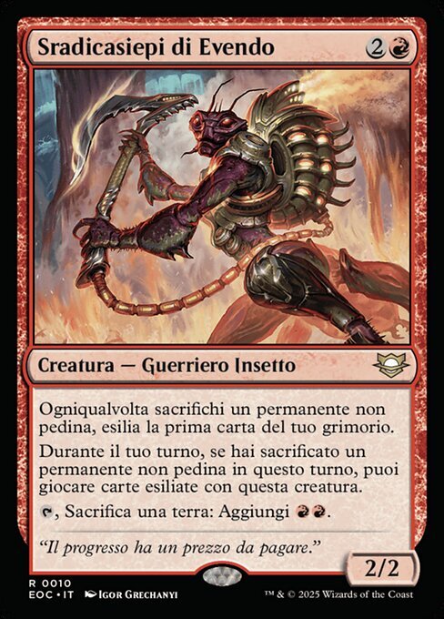 | Rules | Whenever you sacrifice a nontoken permanent, exile the top card of your library. During your turn, as long as you've sacrificed a nontoken permanent this turn, you may play cards exiled with this creature. , Sacrifice a land: Add . |