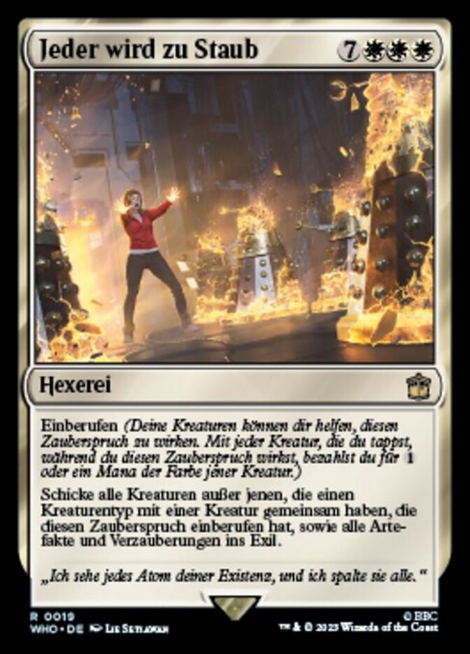 | Rules | Convoke (Your creatures can help cast this spell. Each creature you tap while casting this spell pays for or one mana of that creature's color.) Exile all creatures except those that share a creature type with a creature that convoked this spell, all artifacts, and all enchantments. |