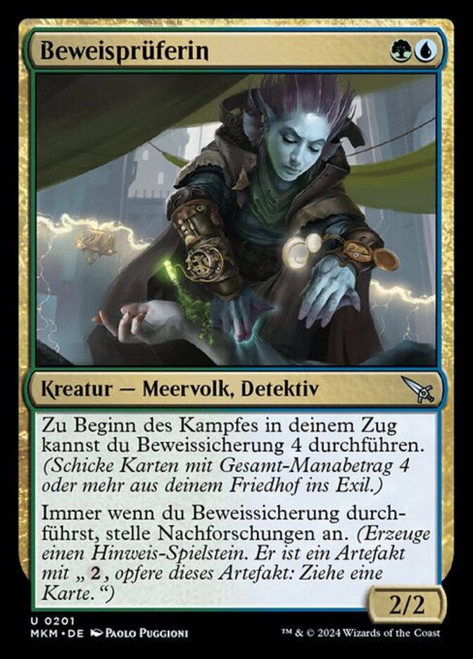 | Rules | At the beginning of combat on your turn, you may collect evidence 4. (Exile cards with total mana value 4 or greater from your graveyard.) Whenever you collect evidence, investigate. (Create a Clue token. It's an artifact with ", Sacrifice this artifact: Draw a card.") |