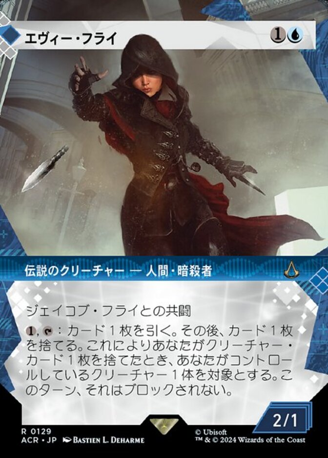 | Rules | Partner with Jacob Frye (When this creature enters the battlefield, target player may put Jacob into their hand from their library, then shuffle.) , : Draw a card, then discard a card. When you discard a creature card this way, target creature you control can't be blocked this turn. |