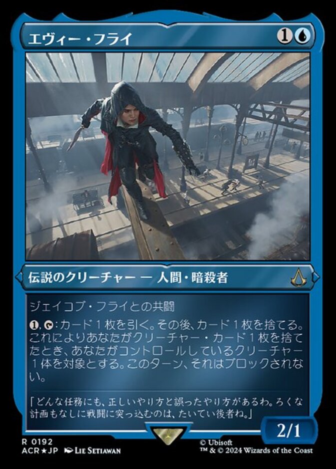 | Rules | Partner with Jacob Frye (When this creature enters the battlefield, target player may put Jacob into their hand from their library, then shuffle.) , : Draw a card, then discard a card. When you discard a creature card this way, target creature you control can't be blocked this turn. |
