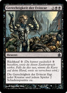 | Rules | Buyback (You may pay an additional as you cast this spell. If you do, put this card into your hand as it resolves.) Evincar's Justice deals 2 damage to each creature and each player. |