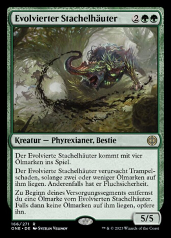 | Rules | Evolved Spinoderm enters the battlefield with four oil counters on it. Evolved Spinoderm has trample as long as it was two or fewer oil counters on it, Otherwise, it has hexproof. At the beginning of your upkeep, remove an oil counter from Evolved Spinoderm. Then if it has no oil counters on it, sacrifice it. |