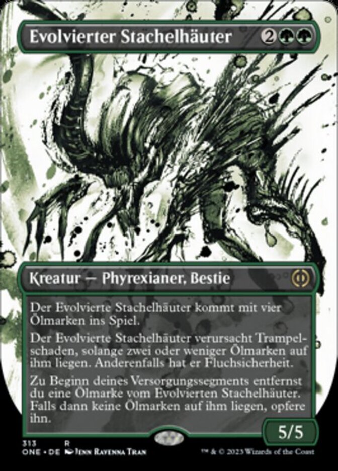 | Rules | Evolved Spinoderm enters the battlefield with four oil counters on it. Evolved Spinoderm has trample as long as it was two or fewer oil counters on it, Otherwise, it has hexproof. At the beginning of your upkeep, remove an oil counter from Evolved Spinoderm. Then if it has no oil counters on it, sacrifice it. |