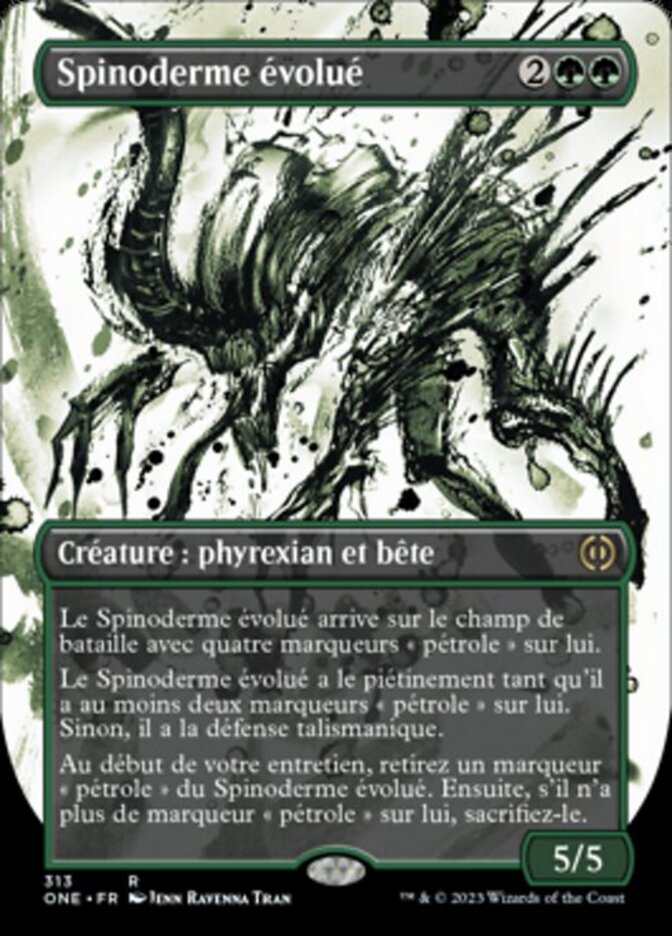 | Rules | Evolved Spinoderm enters the battlefield with four oil counters on it. Evolved Spinoderm has trample as long as it was two or fewer oil counters on it, Otherwise, it has hexproof. At the beginning of your upkeep, remove an oil counter from Evolved Spinoderm. Then if it has no oil counters on it, sacrifice it. |