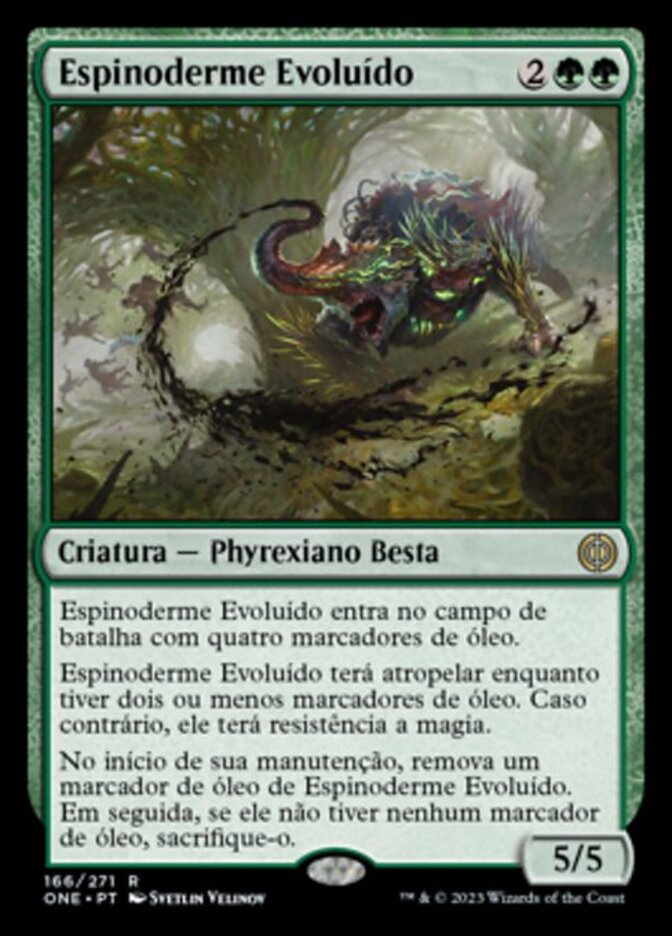 | Rules | Evolved Spinoderm enters the battlefield with four oil counters on it. Evolved Spinoderm has trample as long as it was two or fewer oil counters on it, Otherwise, it has hexproof. At the beginning of your upkeep, remove an oil counter from Evolved Spinoderm. Then if it has no oil counters on it, sacrifice it. |