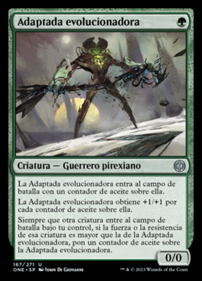 | Rules | Evolving Adaptive enters the battlefield with an oil counter on it. Evolving Adaptive gets +1/+1 for each oil counter on it. Whenever another creature enters the battlefield under your control, if that creature has greater power or toughness than Evolving Adaptive, put an oil counter on Evolving Adaptive. |