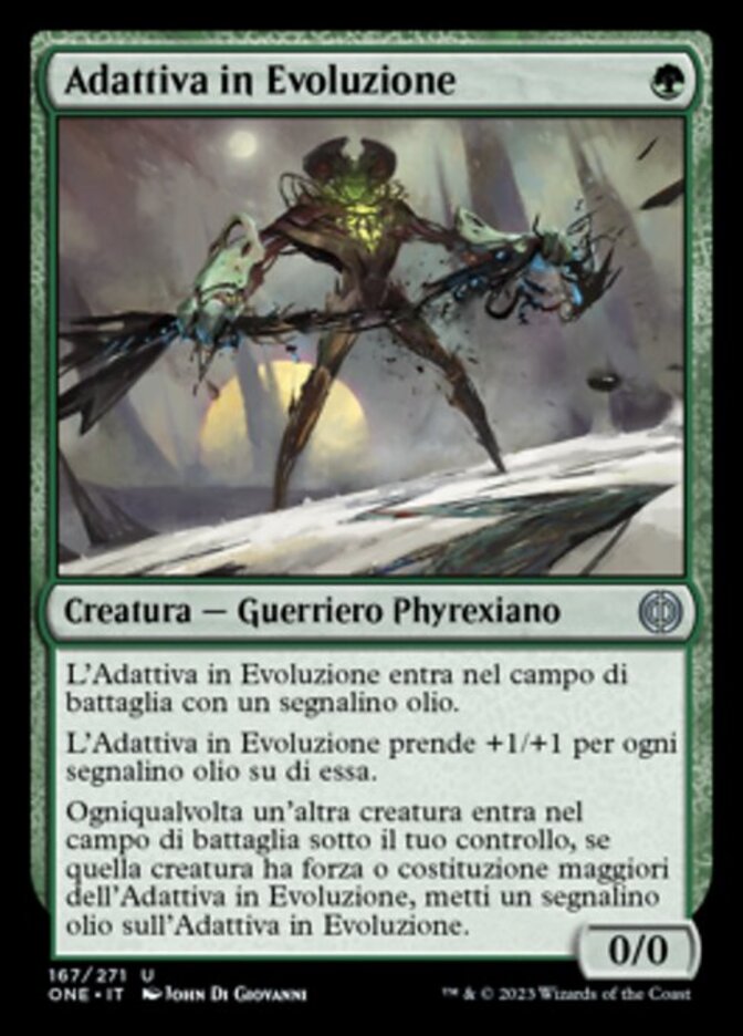 | Rules | Evolving Adaptive enters the battlefield with an oil counter on it. Evolving Adaptive gets +1/+1 for each oil counter on it. Whenever another creature enters the battlefield under your control, if that creature has greater power or toughness than Evolving Adaptive, put an oil counter on Evolving Adaptive. |