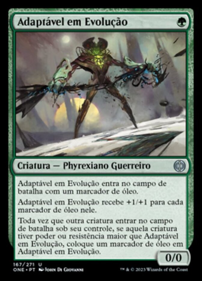 | Rules | Evolving Adaptive enters the battlefield with an oil counter on it. Evolving Adaptive gets +1/+1 for each oil counter on it. Whenever another creature enters the battlefield under your control, if that creature has greater power or toughness than Evolving Adaptive, put an oil counter on Evolving Adaptive. |