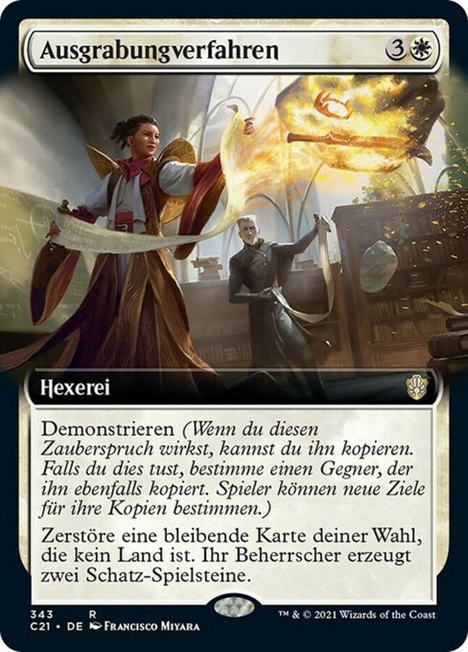 | Rules | Demonstrate (When you cast this spell, you may copy it. If you do, choose an opponent to also copy it. Players may choose new targets for their copies.) Destroy target nonland permanent. Its controller creates two Treasure tokens. |
