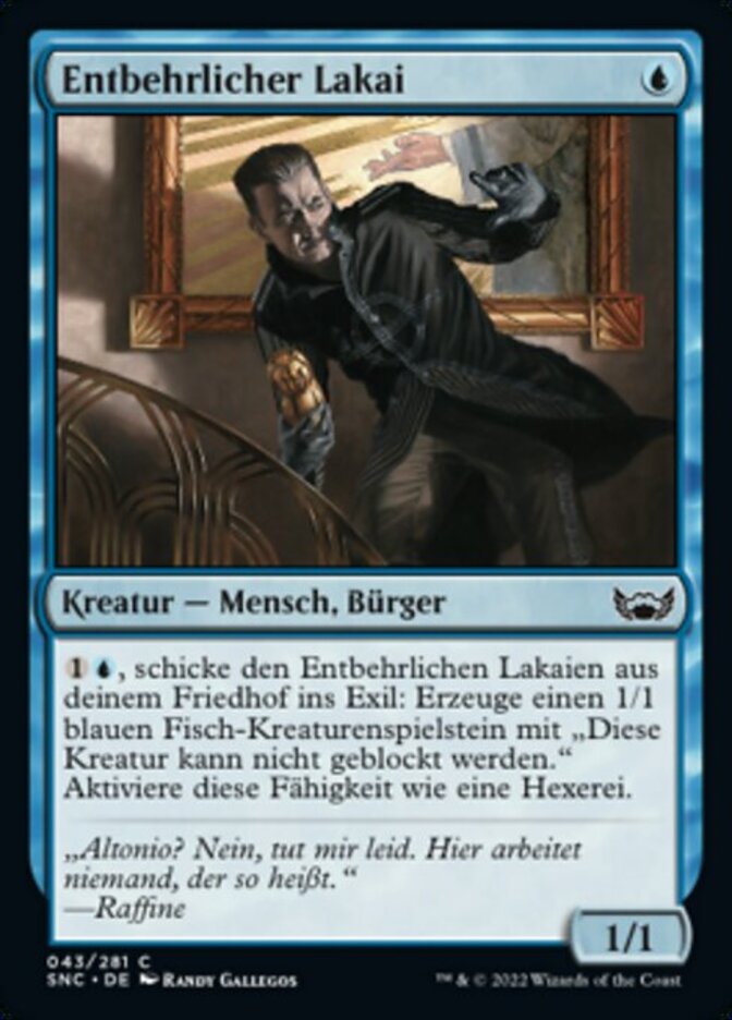 | Rules | , Exile Expendable Lackey from your graveyard: Create a 1/1 blue Fish creature token with "This creature can't be blocked." Activate only as a sorcery. |