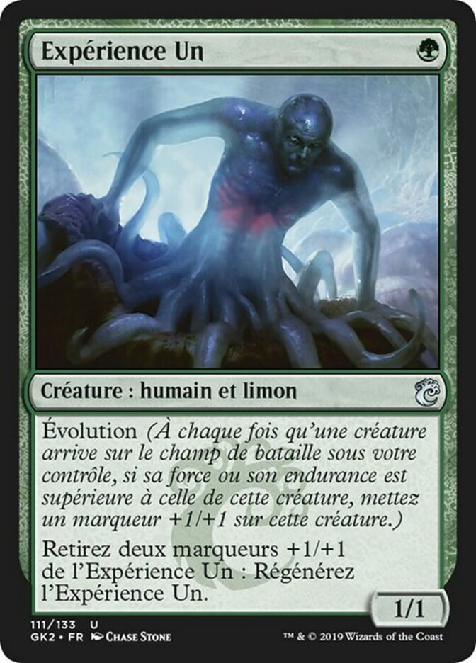 | Rules | Evolve (Whenever a creature enters the battlefield under your control, if that creature has greater power or toughness than this creature, put a +1/+1 counter on this creature.) Remove two +1/+1 counters from Experiment One: Regenerate Experiment One. |