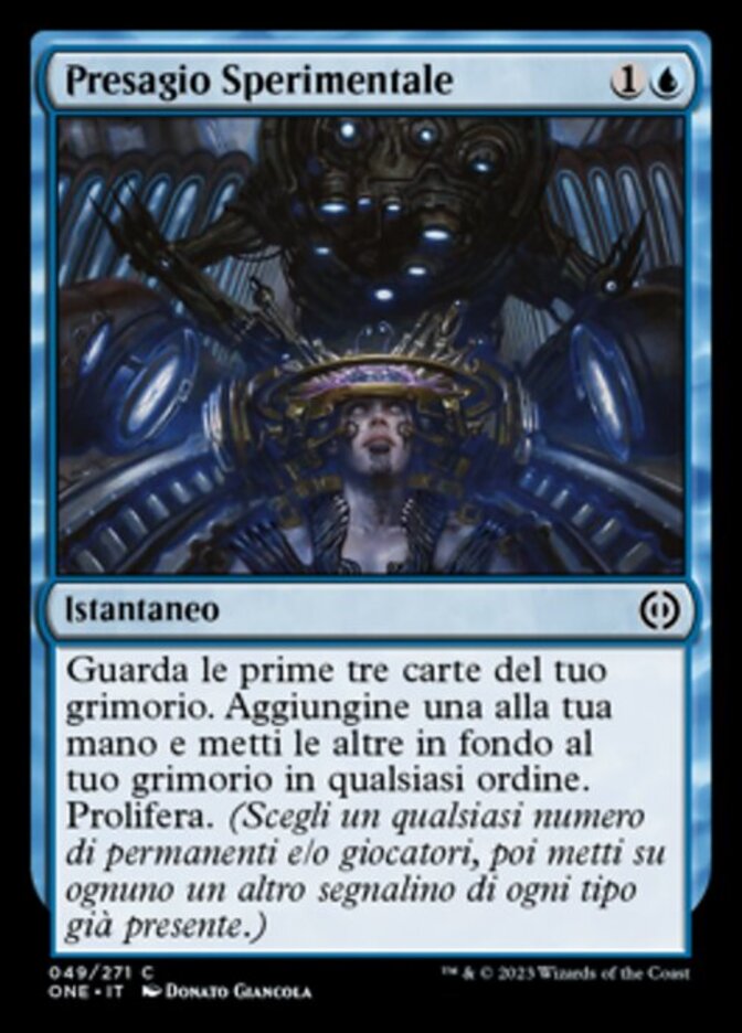| Rules | Look at the top three cards of your library. Put one of them into your hand and rest on the bottom of your library in any order. Proliferate. (Choose any number of permanents and/or players, then give each another counter of each kind already there.) |