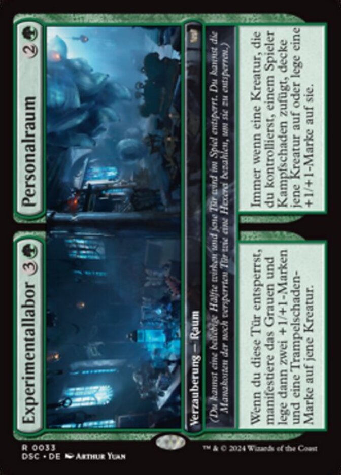 | Rules | (You may cast either half. That door unlocks on the battlefield. As a sorcery, you may pay the mana cost of a locked door to unlock it.) When you unlock this door, manifest dread, then put two +1/+1 counters and a trample counter on that creature. // (You may cast either half. That door unlocks on the battlefield. As a sorcery, you may pay the mana cost of a locked door to unlock it.) Whenever a creature you control deals combat damage to a player, turn that creature face up or put a +1/+1 counter on it. |