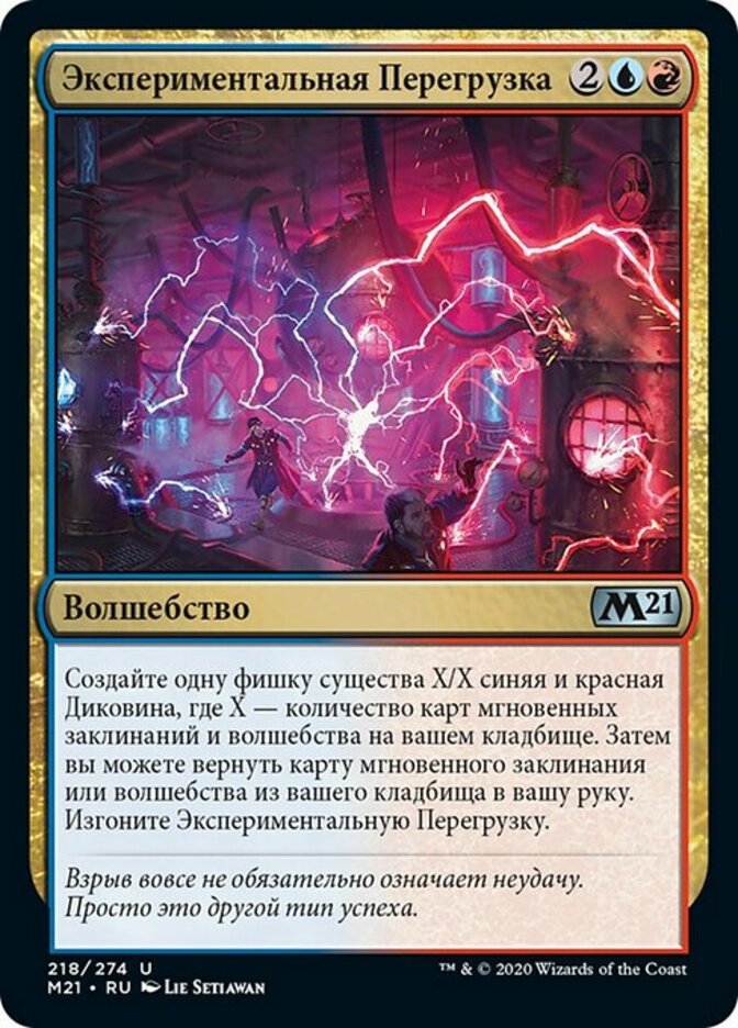| Rules | Create an X/X blue and red Weird creature token, where X is the number of instant and sorcery cards in your graveyard. Then you may return an instant or sorcery card from your graveyard to your hand. Exile Experimental Overload. |
