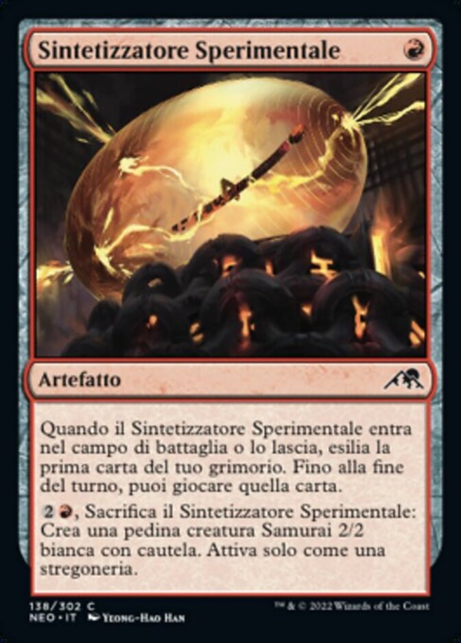 | Rules | When Experimental Synthesizer enters or leaves the battlefield, exile the top card of your library. Until end of turn, you may play that card. , Sacrifice Experimental Synthesizer: Create a 2/2 white Samurai creature token with vigilance. Activate only as a sorcery. |