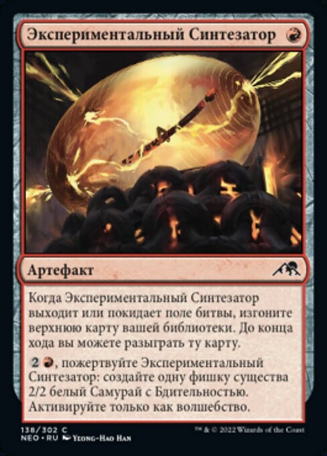 | Rules | When Experimental Synthesizer enters or leaves the battlefield, exile the top card of your library. Until end of turn, you may play that card. , Sacrifice Experimental Synthesizer: Create a 2/2 white Samurai creature token with vigilance. Activate only as a sorcery. |
