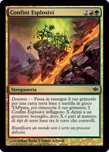 | Rules | Domain — Search your library for a basic land card, put that card onto the battlefield tapped, then shuffle. Exploding Borders deals X damage to target player or planeswalker, where X is the number of basic land types among lands you control. |