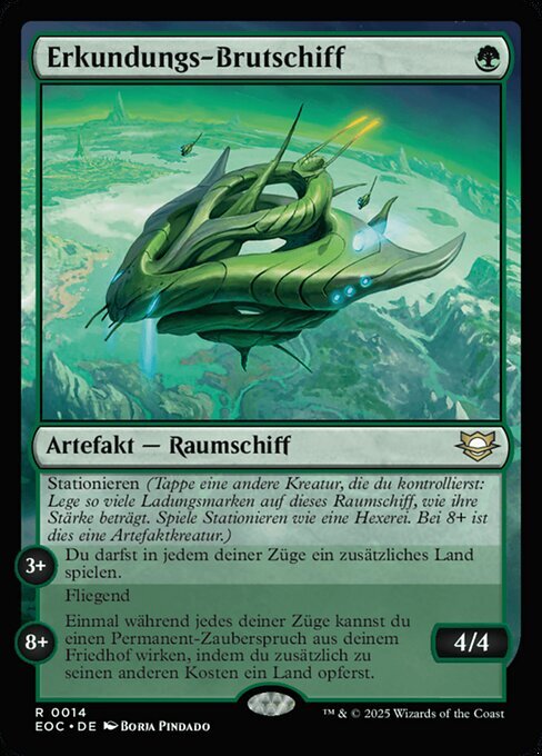 | Rules | Station (Tap another creature you control: Put charge counters equal to its power on this Spacecraft. Station only as a sorcery. It's an artifact creature at 8+.) STATION 3+ You may play an additional land on each of your turns. STATION 8+ Flying Once during each of your turns, you may cast a permanent spell from your graveyard by sacrificing a land in addition to paying its other costs. |