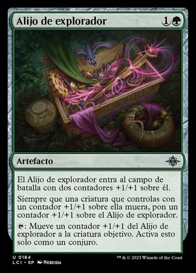 | Rules | Explorer's Cache enters the battlefield with two +1/+1 counters on it. Whenever a creature you control with a +1/+1 counter on it dies, put a +1/+1 counter on Explorer's Cache. : Move a +1/+1 counter from Explorer's Cache onto target creature. Activate only as a sorcery. |